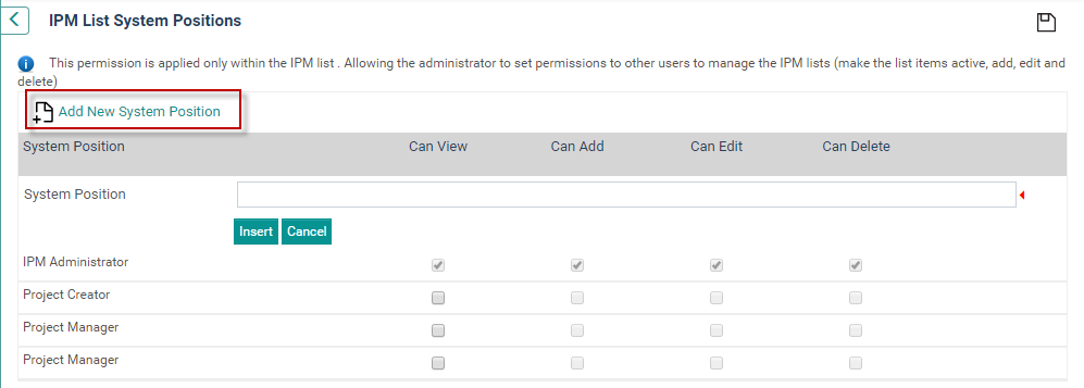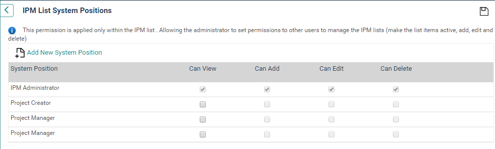 Standard system roles: Administrator, Project Manager and Project Creator positions are included as default in this area. For each system position, 'Can View', 'Can Add', 'Can Edit' and 'Can Delete' permissions are given.