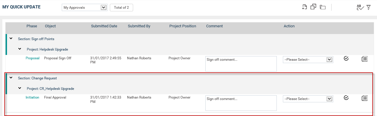 Phase - Displays the phase in which the sign off object is in the change request workflow. Phase name will be hyperlinked. Clicking this will navigate you to the relevant sign off (open in a new window).