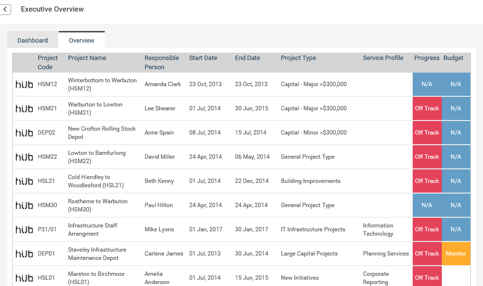 The executive overview section will provides a detailed summary of the projects for the selected hierarchy.