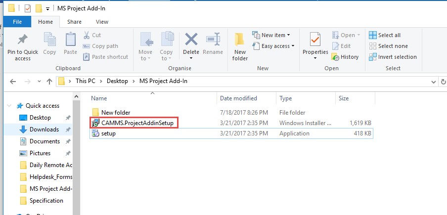 6.Next, navigate to the ‘Destination Folder’ mentioned above and extract the ZIP files. Then open the folder and click on ‘CAMMS.ProjectAddinSetup’.
