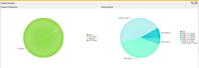 This Pie chart Indicates the overall progress of the organisations' projects categorised as 'On Track, Off Track, Monitor and N/A. Clicking a section of the pie chart will display a detailed view indicating project code, name, project owner and start/end date. |