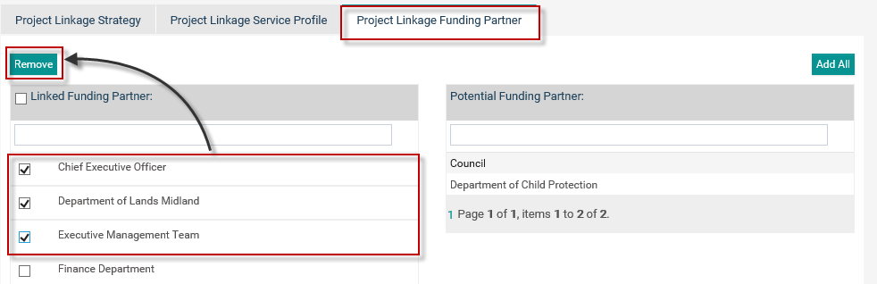 STEP 3: In order to remove funding partner(s), select the funding partners to be removed and click on the 'Remove' button.